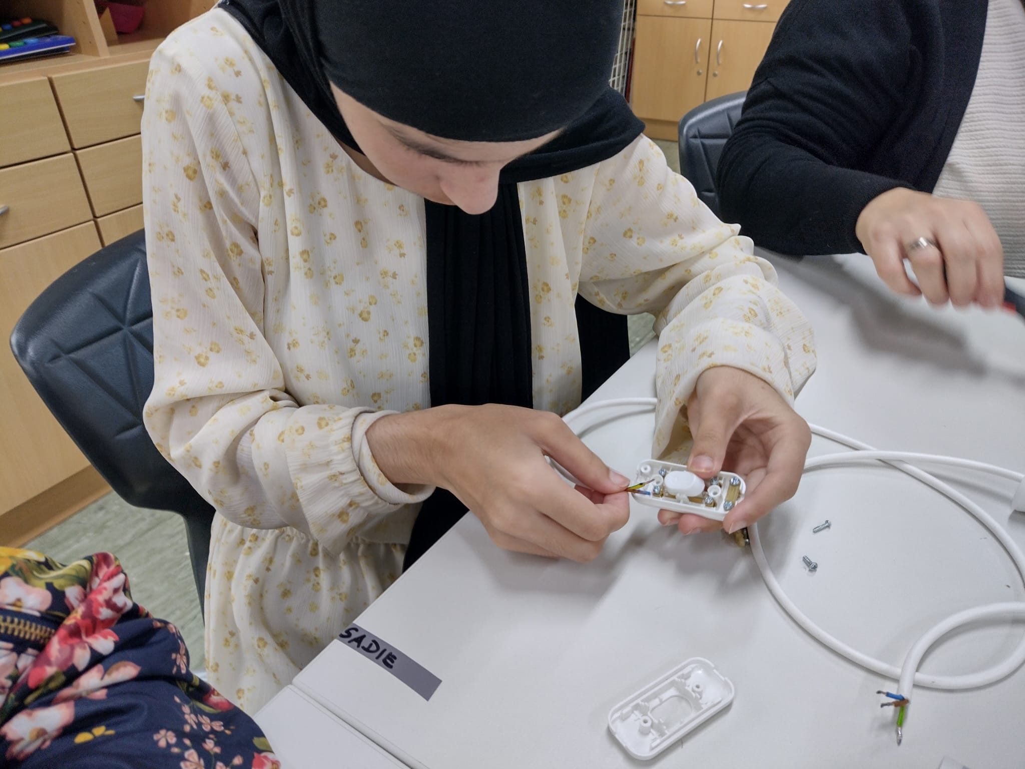 Zum ersten Mal haben wir auch Elektroarbeiten durchgeführt. Wir mussten Kabel zuschneiden, abisolieren und löten, die Kabelenden wurden teilweise mit Schrumpfschlauch verkleidet. Stecker, Schalter und Fassung mussten an die Kabel verbunden werden. Dabei durfte keine Litze vertauscht werden! Das war ganz schön kniffelig.
