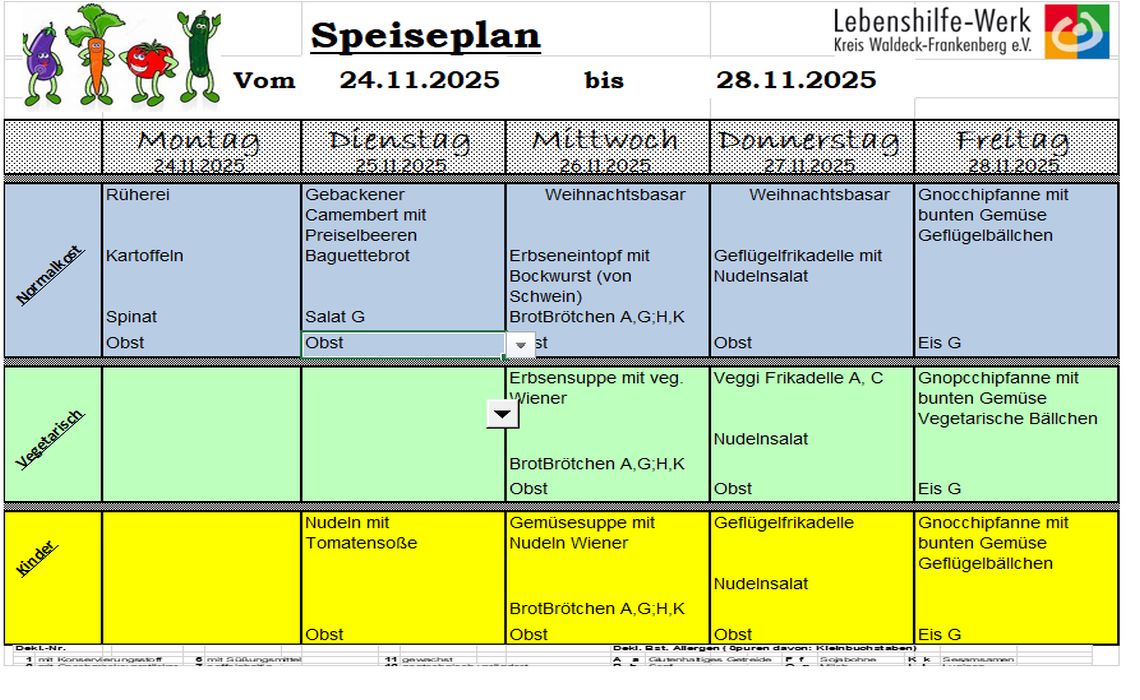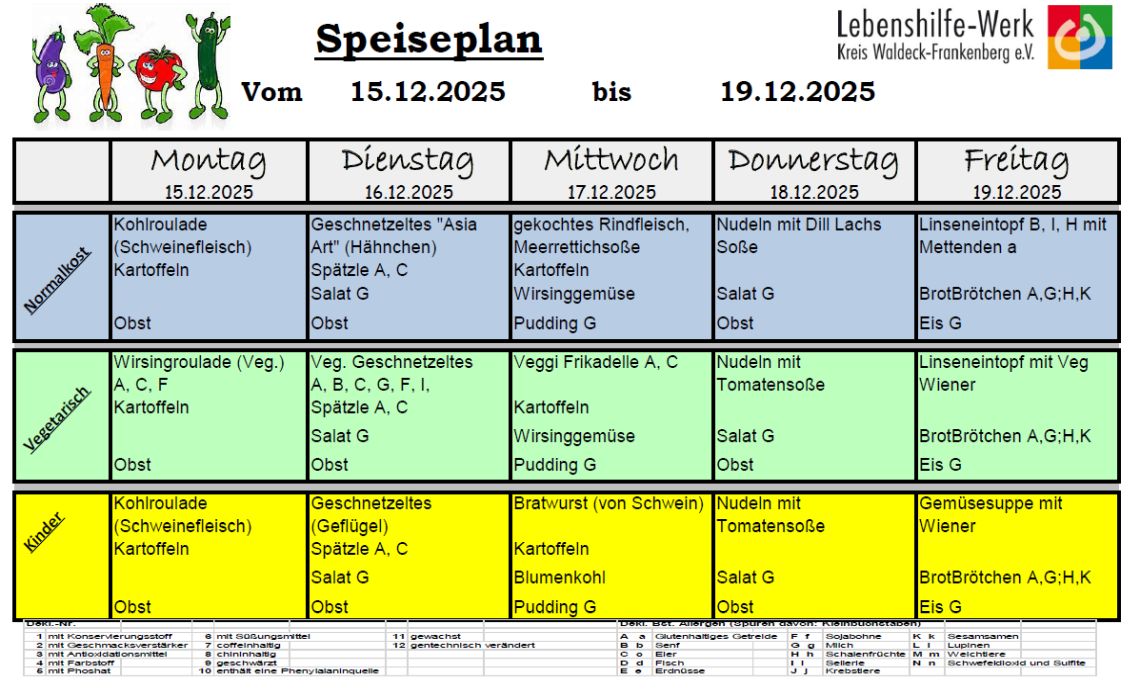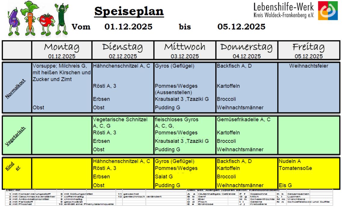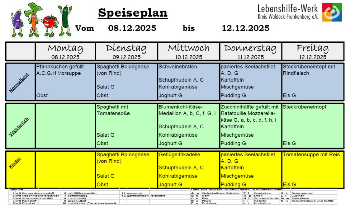 Für die Schüler, die am Nachmittagsunterricht teilnehmen, wird an 3 Tagen ein warmes Mittagessen angeboten, das von der Großküche des Lebenshilfewerkes zubereitet wird.